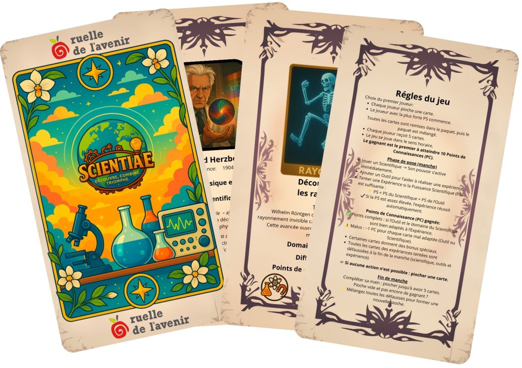 Scientiae est un jeu de cartes stratégique, pour 2 à 5 joueurs, qui vous plonge au cœur de l’histoire des sciences. Chaque joueur incarne une équipe de chercheurs et chercheuses tentant de réaliser des découvertes majeures en combinant : des scientifiques spécialisés dans différents domaines, des outils plus ou moins puissants, des découvertes de complexité variable.